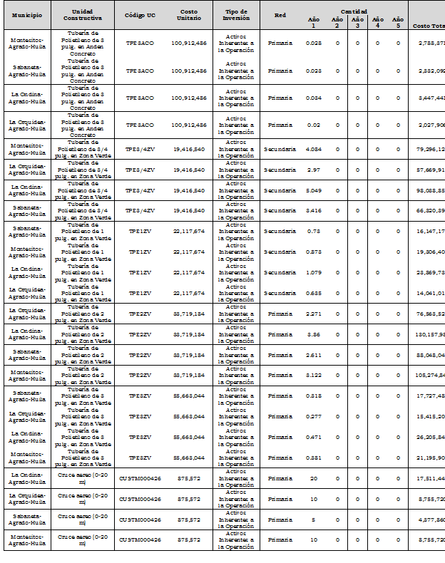 | Sabaneta-Agrado-Huila | Residencial | - | 14,400 | - | 14,640 | - | 14,880 | - | 15,120 | - | 15,360 |