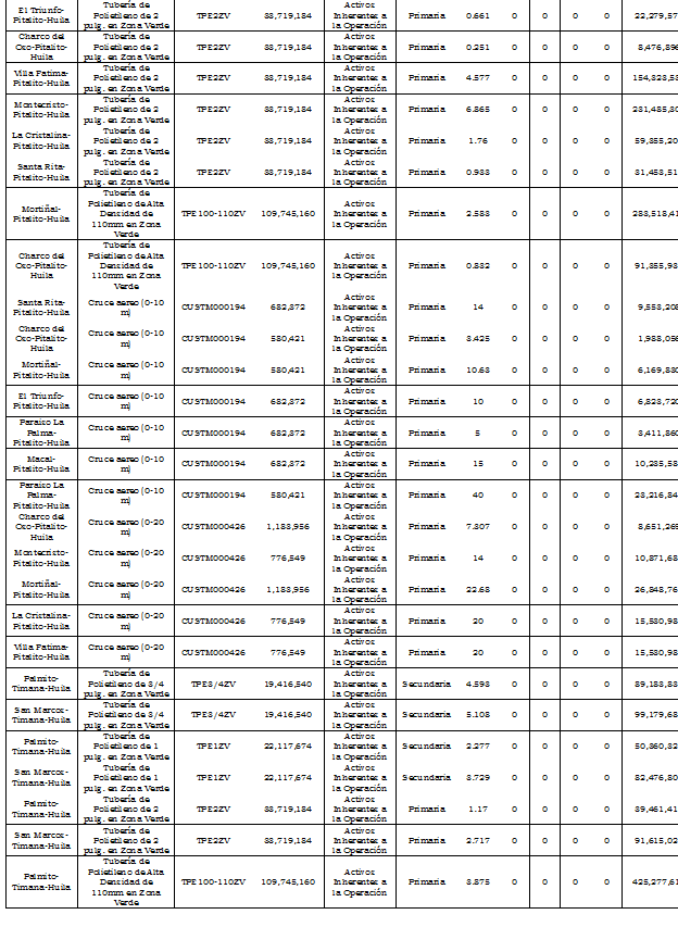 | Palmito-Timana-Huila | Residencial | - | 42,480 | - | 43,440 | - | 44,400 | - | 45,360 | - | 46,320 |