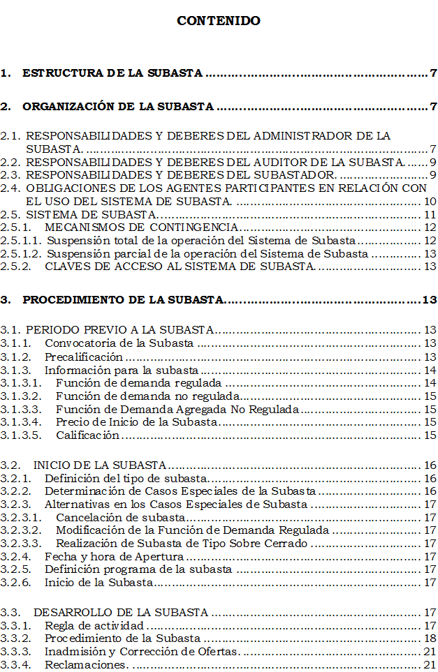 El Reglamento de la Subasta para la Asignación de Obligaciones de Energía del Mercado Organizado se divide en las siguientes partes: (i) Organización de la Subasta, (ii) Procedimiento de la Subasta y (iii) Política de Información.