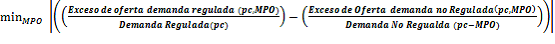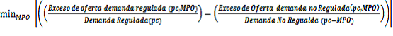 Para calcular los valores anteriores, se sigue un procedimiento que tiene por objeto encontrar el valor del MPO que minimiza el valor absoluto de la diferencia entre el exceso de oferta de productos para demanda regulada y el exceso de oferta para la demanda no regulada. Estos excesos se calculan en porcentaje de la respectiva demanda. Este procedimiento se formula de la siguiente manera: