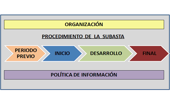 En la organización de la subasta se contemplan las responsabilidades y deberes de los actores (administrador, subastador y auditor) de la subasta, las obligaciones de los agentes participantes en relación con el uso del sistema de subasta, el Sistema de Subasta y los mecanismos de contingencia.