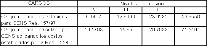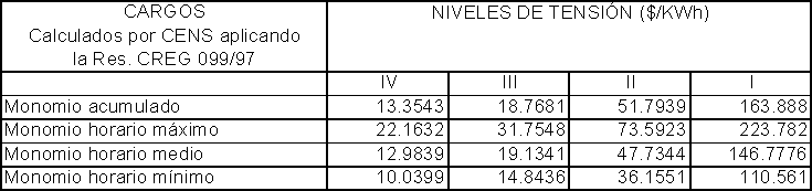 Al hacer el cálculo de los cargos por uso del sistema, señalados en la resolución 099 de 1997, dio como resultado los valores que se muestran a continuación, los cuales al compararse con los de otras partes del país son mayores, debido a que gran parte de la infraestructura de CENS está dedicada a atender electrificación rural y barrios subnormales, lo cual incide notoriamente en el calculo de estos costos.