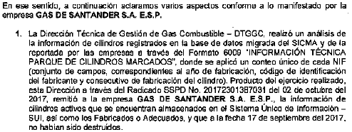 En respuesta al auto de pruebas la Superintendencia de Servicios Públicos Domiciliarios expuso lo siguiente parta el caso de la empresa Gas de Santander: