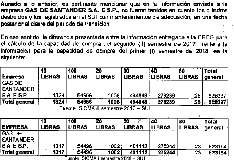 Para la empresa Gas de Santander S.A. E.S.P. los requerimientos sobre la capacidad de los cilindros y tanques está conforme al requerimiento de la SSPD, toda vez que los tamaños reportados coinciden con el comunicado de la SSPD 20172301225561, sobre la cual Informó la DTGGG, así como los reportes en Kilogramos. La Información actualizada enviada por la Dirección corresponde a los dispuesto en la Resolución CREG 063 de 2016.”