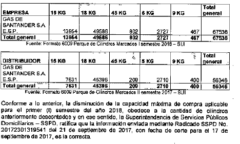 Sumado a lo anterior, Gas de Santander S.A. E.S.P. ha ingresado nuevos cilindros al mercado en lo corrido del año para atender la distribución de GLP en su área de influencia. Mediante comunicación de la Superintendencia de Servicios Públicos radicado No, 20172301387031 de fecha 02.10.2017 por medio de la cual la SSPD remitió la información actualizada de cilindros activos que reposa en la base de datos del SUI, en un CD donde se identifica, que el número de cilindros cargados desde 2008 hasta 2016 fueron 875.487 cilindros y en el año 2017 se cargaron 15.243, para un número total de cilindros de 890.730. Para el año 2016 la capacidad de los tanques estacionarios ascendía de 1.192.858.8 kilogramos para Gas de Santander S.A. E.S.P. Los tanques estacionarios se han incrementado con relación al año anterior en 85.165.5 kilogramos.