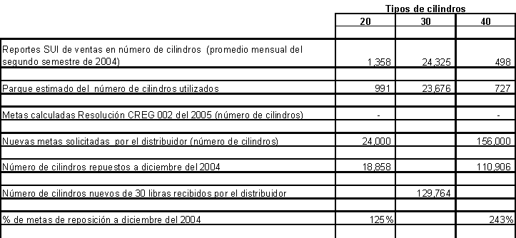 De otra parte para definir las metas individuales de reposición aplicables al año 2005, contenidas en la Resolución CREG 002 de 2005 , se estimó el tamaño del parque de cilindros en circulación para atender la demanda actual del Servicio Público Domiciliario de GLP. Esto se realizó con base en la información de ventas reportadas al SUI por cada uno de los distribuidores durante el segundo semestre de 2004 y utilizando los criterios detallados en el documento 007 del 24 de febrero de 2005 soporte de la Resolución 002 objeto de recurso.