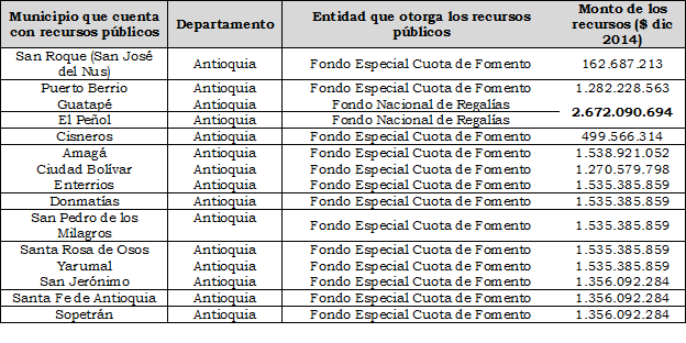 De esta manera, los aportes del Fondo Nacional de Regalías al proyecto ejecutado en el mercado conformado por los municipios de Guatapé y El Peñol en el departamento de Antioquia y que financia infraestructura de distribución corresponde a $2.672.090.694 y no los $ 2.741.937.358 presentados por la empresa en la solicitud tarifaria inicial de octubre de 2015, y la cual fue tenida en cuenta en el cálculo de los cargos aprobados en la Resolución CREG 175 de 2017, por lo que se procederá a calcular los cargo conforme a los recursos públicos correctos.
