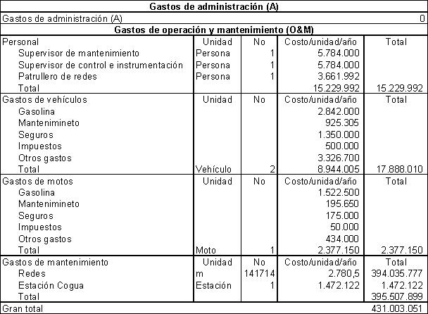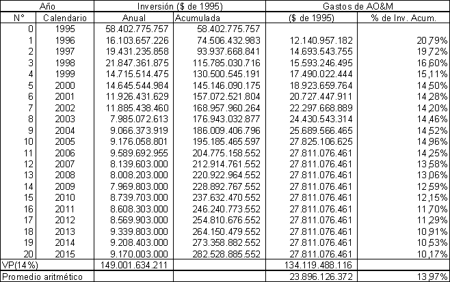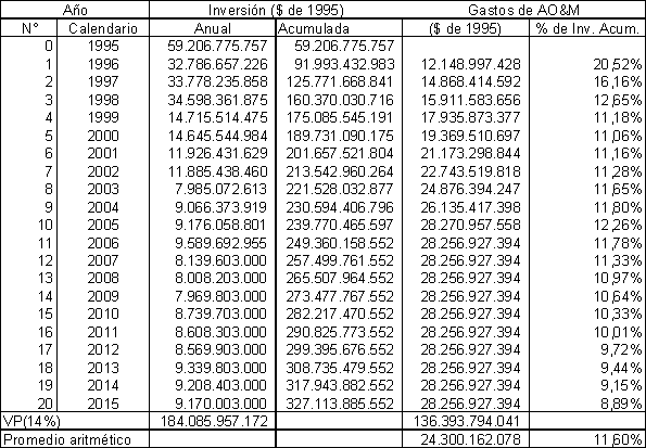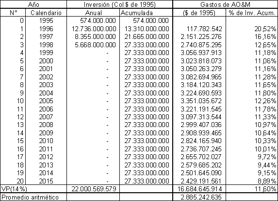 Al comparar los valores anuales de los gastos de Administración, Operación y Mantenimiento (AOM) con la inversión acumulada, incluidos dentro del cálculo del Dt en 1996, se observa que el promedio de los porcentajes que representan los AOM anuales frente a la inversión acumulada es del 10.5%. De acuerdo con la solicitud de separación, el valor promedio para la parte correspondiente a transporte sería del 0.9%, y para la parte de distribución del 12.8%.