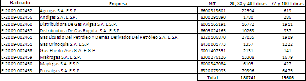 2. El representante legal de la empresa Unicogas manifiesta que en la Resolución CREG 078 de 2009 no se tuvieron en cuenta 7.704 metas del grupo de cilindros de 20, 33 y 40 libras y 1.320 metas del grupo de cilindros de 77 y 100 libras, cedidas por la empresa Makrogas S.A. E.S.P. a UNICOGAS S.A. E.S.P. y aceptadas por esta última previo el trámite de rigor.