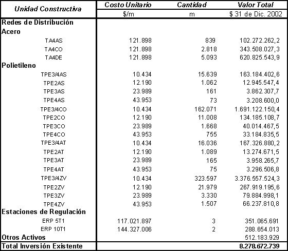 2.1. Inversión Existente. Como inversión existente se reconoce un monto de $8.278.672.739 ($ del 31 de Diciembre de 2002), de conformidad con la desagregación de activos presentada en el Anexo 1A de la presente Resolución.