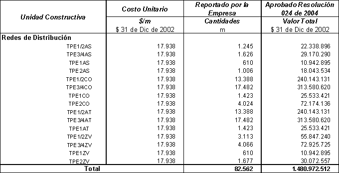 La cantidad de redes de distribución reportada por la Empresa como Inversión Existente en la solicitud tarifaria de 2003, difiere de la cantidad de los activos de la Inversión Existente que fue aprobada por la Comisión en la revisión tarifaria anterior (El valor aprobado está contenido en la Resolución CREG 011 de 1997), y conforme lo establece la Resolución CREG 011 de 2003, se deben utilizar “los activos existentes en la última revisión tarifaria, reportados por la Empresa, tal como fueron considerados y valorados en dicho momento por la Comisión”, que corresponde al valor presentado en la Tabla anterior.