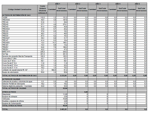 La Empresa, mediante la comunicación en cita reportó a la CREG las proyecciones de demanda, las proyecciones de gastos de AOM de distribución y el programa de nuevas inversiones, clasificadas según el listado de unidades constructivas establecido en el Anexo No. 1 de la Resolución CREG 011 de 2003.