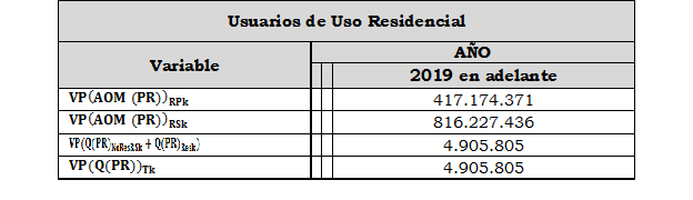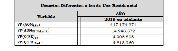 Aplicando la metodología contenida en la Resolución CREG 202 de 2013 y sus modificaciones y adiciones, se calcularon conforme a las formulas establecidas en los numerales 9.1.1.3. y 9.2.1.3. del artículo 9 para la componente que remunera los gastos de AOM, aplicable a usuarios de uso residencial y a usuarios diferentes a los de uso residencial, las siguientes variables principales: