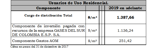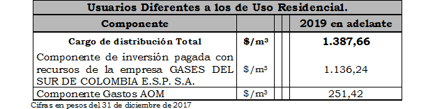 Dado que el sistema de distribución presentado por la empresa GASES DEL SUR DE COLOMBIA E.S.P. S.A. para el mercado relevante solicitado, cuenta con red primaria y secundaria y todos sus usuarios están conectados a la red secundaria, se podrá determinar para este mercado relevante un solo cargo de distribución que será aplicable a los usuarios de uso residencial y usuarios diferentes al uso residencial.