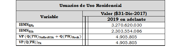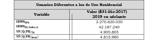 Aplicando la metodología contenida en la Resolución CREG 202 de 2013 y sus modificaciones y adiciones, se calcularon conforme a las formulas establecidas en los numerales 9.1.1.3. y 9.2.1.3. del artículo 9 para la componente que remunera la inversión base, aplicable a usuarios de uso residencial y a usuarios diferentes a los de uso residencial y se obtuvieron las siguientes variables principales: