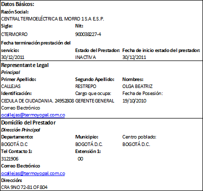Con lo anterior se evidencia que la empresa Central Termoeléctrica el Morro 1 S.A E.S.P canceló el Registro Único de Prestadores de Servicios –RUPS y finalizó actividades el día 30 de diciembre de 2011, lo que demuestra que durante el año 2011 fue prestador del servicio de Energía Eléctrica y por lo tanto era sujeto de regulación por lo que en principio debía incluirse en la resolución CREG-119 de 2012.