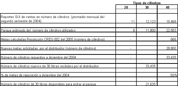 Adicionalmente la programación de cilindros de 40 libras ha contemplado un horizonte de varios años, lapso en el cual la totalidad de estos cilindros debe ser repuesto. De otra parte se considera que los cilindros de 20 libras que aun permanecen en el parque serán repuestos en el término de un año.