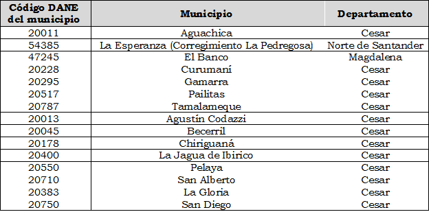 5.1. Municipios que pertenecen al Mercado Relevante definido en el Artículo 1 que no cuentan con recursos públicos. Para los municipios de Aguachica, Curumaní, Gamarra, Pailitas, Tamalameque, Becerril, Chiriguaná, La Jagua de Ibirico, Pelaya y San Alberto en el departamento de Cesar; el municipio de El Banco en el departamento de Magdalena; y el municipio de La Esperanza (Corregimiento La Pedregosa) en el departamento de Norte de Santander, los cargos transitorios aplicables son: