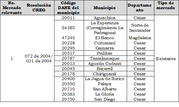 Mediante las Resoluciones CREG 031 y 072 de 2004 se aprobaron el Cargo Promedio de Distribución por uso del Sistema de Distribución de gas combustible por red y el Cargo Máximo Base de Comercialización de gas combustible por redes a usuarios regulados, para el mercado relevante conformado por los municipios de San Diego, Agustín Codazzi, Becerril, La Jagua de Ibirico, Curumaní, Chiriguaná, Pailitas, Tamalameque, Pelaya, La Gloria, Aguachica, Gamarra y San Alberto en el departamento del Cesar; así como el municipio de El Banco en el departamento de Magdalena y el municipio de La Esperanza en el departamento Norte de Santander según solicitud tarifaria presentada por la empresa GAS NATURAL DEL CESAR S.A. E.S.P.