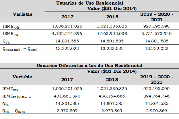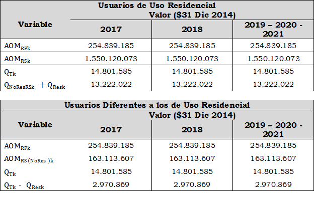 Aplicando la metodología contenida en la Resolución CREG 202 de 2013 y sus modificaciones y adiciones, se calcularon conforme a las formulas establecidas en los numerales 9.1.1.1. y 9.2.1.1. del artículo 9 para la componente que remunera los gastos de AOM, aplicable a usuarios de uso residencial y a usuarios diferentes a los de uso residencial, las siguientes variables principales: