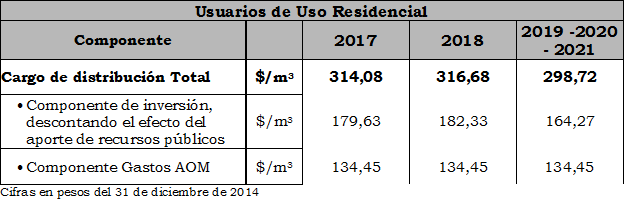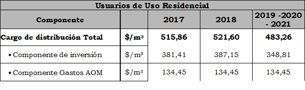 ARTÍCULO 5. Cargos de distribución aplicables a los usuarios de Uso Residencial. A partir de la vigencia de la presente Resolución, los cargos de distribución aplicables a los usuarios de uso residencial para recuperar los costos de inversión y los gastos de AOM para la distribución domiciliaria de gas combustible por red se fijan transitoriamente tal como se indica a continuación.