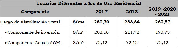 ARTÍCULO 6. Cargos de distribución aplicables a los usuarios Diferentes a los de Uso Residencial. A partir de la vigencia de la presente Resolución, los cargos de distribución aplicables a los usuarios Diferentes a los de uso residencial para recuperar los costos de inversión y los gastos de AOM para la distribución domiciliaria de gas combustible por red se fijan transitoriamente tal como se indica a continuación.