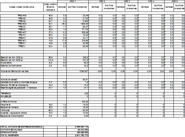 La solicitud tarifaria presentada por Gases del Sur de Santander S.A. E.S.P. incluye las proyecciones de demanda, las proyecciones de gastos de AOM de distribución y el Programa de Nuevas Inversiones, clasificadas según el listado de unidades constructivas establecido en el Anexo No. 1 de la Resolución CREG 011 de 2003.