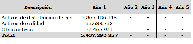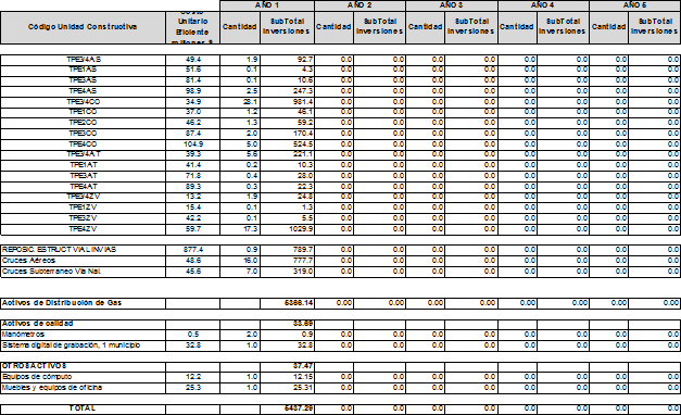 La solicitud tarifaria presentada por METROGAS DE COLOMBIA S.A. E.S.P. incluye las proyecciones de demanda, las proyecciones de gastos de AOM de distribución y el Programa de Nuevas Inversiones, clasificadas según el listado de unidades constructivas establecido en el Anexo No. 1 de la Resolución CREG 011 de 2003.