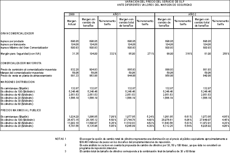 Al respecto se observa que la diferencia real en precio no es significativa por lo que no podrá ocasionar grandes impactos en el flujo mensual de fondos de los usuarios, según los análisis efectuados por los técnicos de la CREG. Así Quienes estaban usando cilindros de 20 libras y ahora usarán de 30 libras, reducirán en un 1% el costo por galón consumido. Quienes usaban cilindros de 40 libras o 100 libras, y ahora tengan que usar cilindros de 30 libras y 80 libras, incrementarán el precio por galón en 3.7% y 1.7% respectivamente, para un impacto total ponderado de 2.4%, es decir menos de $38/galón. El impacto no es significativo, en términos porcentuales, si se compara con el mejoramiento de la seguridad obtenida por los usuarios.