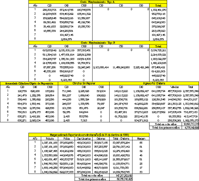 Anexo, en los Cuadros 2 y 3, se observa la estimación económica de beneficios alcanzados por las medidas adoptadas en cuanto a costos de reposición, así como los cálculos de los márgenes de seguridad correspondientes. El Cuadro 4 contiene los análisis que se realizaron con respecto al impacto tarifario causado por los diferentes valores de márgenes de seguridad. Se concluyó que la combinación de tamaños más económica fue la que finalmente se aprobó.