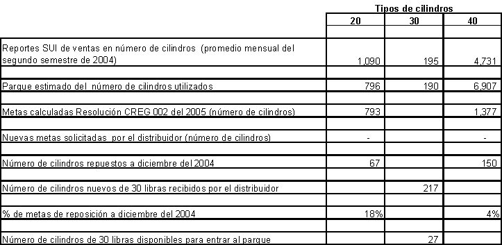 “Como oportunamente se le expuso a la Superintendencia de Servicios Públicos y a la CREG en informe SUI radicado con fecha junio 7 de 2004, la empresa cuenta con un inventario de 100 cilindros de 20 libras, 506 de 30 libras y 520 de 40 libras, al cual solicito que esa entidad se remita para su constatación. Al realizar el correspondiente cálculo, se está imponiendo a la empresa reponer en un trimestre el 50.5% deI parque de cilindros de 20 libras, y el 66%, siendo de importancia cardinal anotar que el volumen de cilindros de 30 libras de la empresa asciende a 506, que es igual al parque de cilindros de 40 libras.