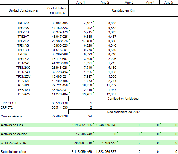 La solicitud tarifaria presentada por Alcanos de Colombia S.A. ESP. incluye las proyecciones de demanda, las proyecciones de gastos de AOM de distribución y el Programa de Nuevas Inversiones, clasificadas según el listado de unidades constructivas establecido en el Anexo No. 1 de la Resolución CREG 011 de 2003.