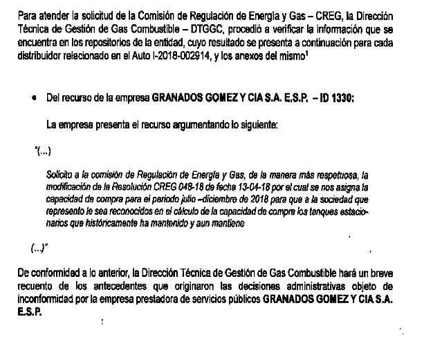 Mediante oficio con radicado CREG E-2018-005868 la Superintendencia de Servicios Públicos Domiciliarios a través de la Delegada de Energía Eléctrica y Gas Combustible remitió la información solicitada por esta Comisión. En atención a lo anterior procederá esta Comisión a exponer el análisis de los resultados de la misma a efectos de resolver las consideraciones y argumentos expuestos por parte de Granados Gómez en su recurso frente a la Resolución CREG 048 de 2018.