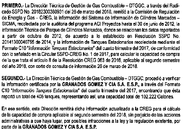 Granados Gómez como distribuidor y comercializador minorista de GLP, solicita que sea reevaluada y puesto a consideración la capacidad de compra notificada mediante resolución CREG 048 de 2018 emitida por la CREG donde se asigna solamente 1.457.200 UN MILLON CUATROSCIENTOS CINCUENTA Y SIETE MUL DOSCIENTOS KILOS, para el período julio – diciembre de 2018 haciendo falta para Granel.