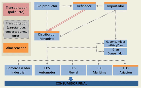 Estos tres agentes (refinador, importador y productor de biocombustibles) son quienes realizan el suministro de los combustibles para la distribución a nivel mayorista.