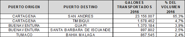 Los volúmenes asociados a estos tramos, como se describió en la Tabla 2, (numeral 1.3), se concentran principalmente en la ruta Cartagena-San Andrés para el año 2016.