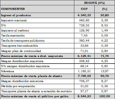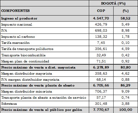 2001 | Revisa estructura de precios, teniendo en cuenta el régimen especial que estableció la Ley 47 de 1993 | (Res. 80725) Modif. Art. 7 Res. 82438 (Res. 80727) Modif. Art. 7 Res. 82439 | Precio máximo de venta en planta de abasto, GMC y Diesel en el departamento de San Andrés y Providencia. PMA(t) = PMI(t) + Md + Costo del cabotaje entre Cartagena y San Andrés | 270,00 |