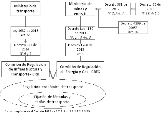 La función de regulación descrita en el párrafo anterior, fue reasignada parcialmente a la CREG, mediante el numeral 1 del artículo 3 del Decreto ley 4130 de 2011 que estableció en cabeza de la Comisión la misma función, la cual fue reglamentada posteriormente en el numeral 6, artículo 3 del Decreto 1260 de 2013.