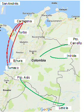 Con este contexto, los principales tramos de transporte marítimo se encuentran en la Ilustración 9 en líneas rojas. La línea roja punteada para el trayecto Cartagena-Tumaco indica la solicitud anteriormente mencionada.
