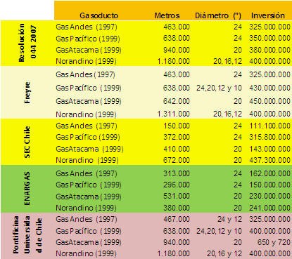 La CREG revisó las fuentes que se utilizaron para establecer los valores de la inversión de los gasoductos que se tomaron como referencia, en la Resolución CREG 044 de 2007, y encontró que especialmente el dato de inversión en los gasoductos Atacama y Pacífico es diferente.