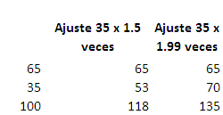 En la Tabla 4 se muestra, a través de un ejemplo, el efecto o la diferencia entre un ajuste de 1.5 veces y otro de 1.99 veces. Se advierte un efecto significativo: El valor inicial (118) debería ajustarse en 1.15 veces para llegar a 135.