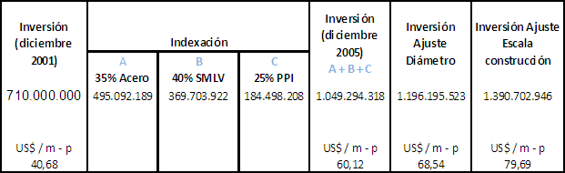 En las estimaciones que se hicieron para la Resolución CREG 044 de 2007 se encontró necesario hacer un ajuste de 1.5 veces en el 35% de la inversión. Este porcentaje refleja la porción que se afecta por los movimientos del acero.