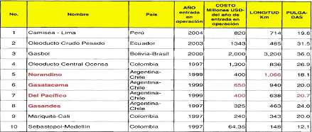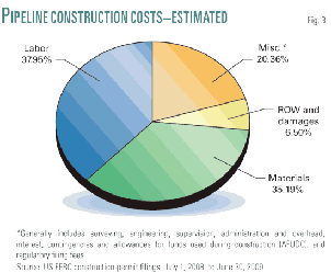 En el volumen 107, número 34, de septiembre de 2009, la revista especializada Oil & Gas Journal presenta los siguientes costos en la construcción de un gasoducto: