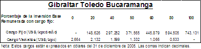 “ARTÍCULO 7. CARGOS FIJOS Y VARIABLES REGULADOS DE REFERENCIA PARA LA REMUNERACIÓN DE LOS COSTOS DE INVERSIÓN. A partir de la vigencia de la presente Resolución, se aplicarán las siguientes Parejas de Cargos Regulados que remuneran los costos de inversión para el Gasoducto Regional Gibraltar-Toledo-Bucaramanga definido en el Artículo 3 de la presente Resolución: