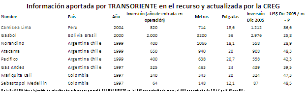 De la muestra aportada por TRANSORIENTE (ver Tabla 2), el gasoducto de Camisea, el cual tiene características de perfil y dificultad de construcción similares al de Gibraltar Toledo Bucaramanga, muestra un costo unitario significativamente superior al observado, en cualquiera de las fuentes de información.