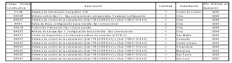 Que CODENSA S.A. E.S.P. en comunicación dirigida a la CREG, radicada con el número E-2005-008491 del 16 de noviembre de 2005, solicitó a la CREG la actualización del Costo Anual por el Uso de los Activos del Nivel de Tensión 4 por la entrada en operación de la subestación Chía; el Sistema de Información Geográfico; el circuito Cáqueza – La reforma 115 kV; Unidad Constructiva de Centro de Control de la Subestación San Mateo y Sistemas de Control de las Subestaciones Charquito, Centro Urbano, Gorgonzola, Mosquera, San Facón y San José, con el objeto de incluir los siguientes activos que entraron en operación durante los años 2003, 2004 y 2005: