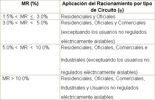 Racionamiento Programado. Déficit originado en una limitación técnica identificada (incluyendo la falta de recursos energéticos) o en una catástrofe natural, que implican que el parque de generación es insuficiente para cubrir la demanda total esperada del Sistema Interconectado Nacional.