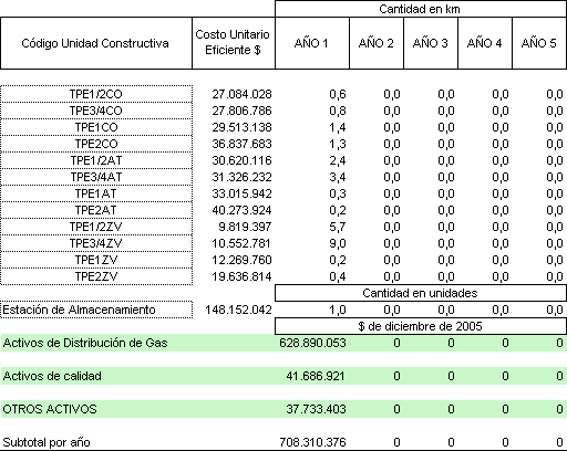 Que la solicitud tarifaria presentada por Surcolombiana de Gas S.A. ESP. incluye las proyecciones de demanda, las proyecciones de gastos de AOM de distribución y el Programa de Nuevas Inversiones, clasificadas según el listado de unidades constructivas establecido en el Anexo No. 1 de la Resolución CREG 011 de 2003;