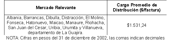 Que la Comisión de Regulación de Energía y Gas, en su sesión 232 del 23 de marzo de 2004, aprobó el Cargo Promedio por Uso del Sistema de Distribución y el Cargo Máximo Base de Comercialización del Mercado Relevante conformado por los municipios de Albania, Barrancas, Dibulla, Distracción, El Molino, Fonseca, Hatonuevo, Maicao, Manaure, Riohacha, San Juan del Cesar, Uribia, Urumita y Villanueva, departamento de La Guajira.
