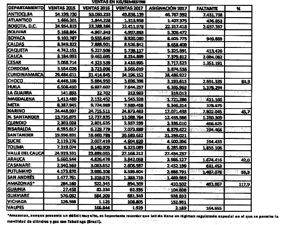 > Con el fin de determinar en forma clara y confiable el faltante temporal, se procedió a realizar un balance para cada uno de los departamentos del territorio nacional entre las ventas históricas reportadas al SUI del año 2015, 2016 y hasta junio de 2017 y el producto asignado para el segundo semestre de 2017. (dentro del producto asignado se contabilizan la OPC ordinaria, las OPC extraordinarias y los contratos de otros campos con precio libre).
